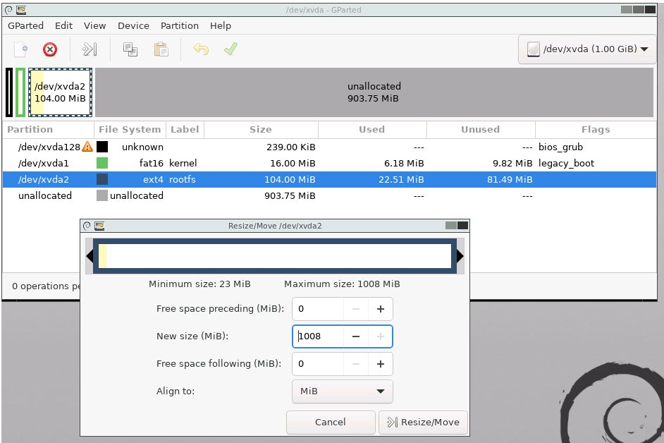 Then enlarge the last partition /dev/xvda2 to the maximum available storage space and save/confirm.