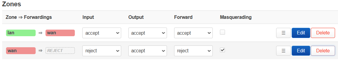 Under Network > Firewall are the firewall settings, which are kept quite simple for our purposes. With 4G/5G connections, there are usually no incoming connections or port forwarding.