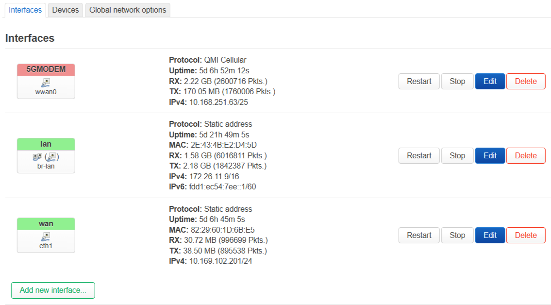 Then OpenWRT “5GMODEM” interface “Restart” buttonAnd after a short time a virtual dynamic interface (DHCP client) with IP address appears or the IP address directly in the modem interface.